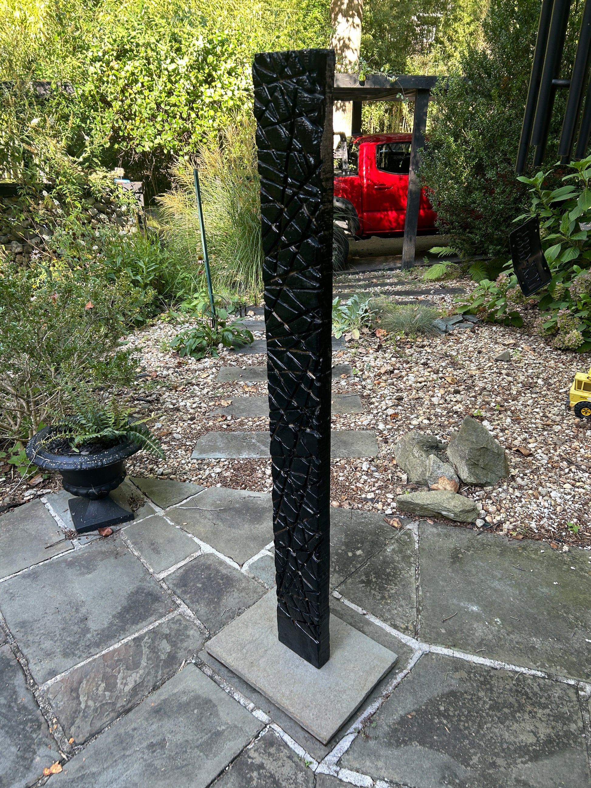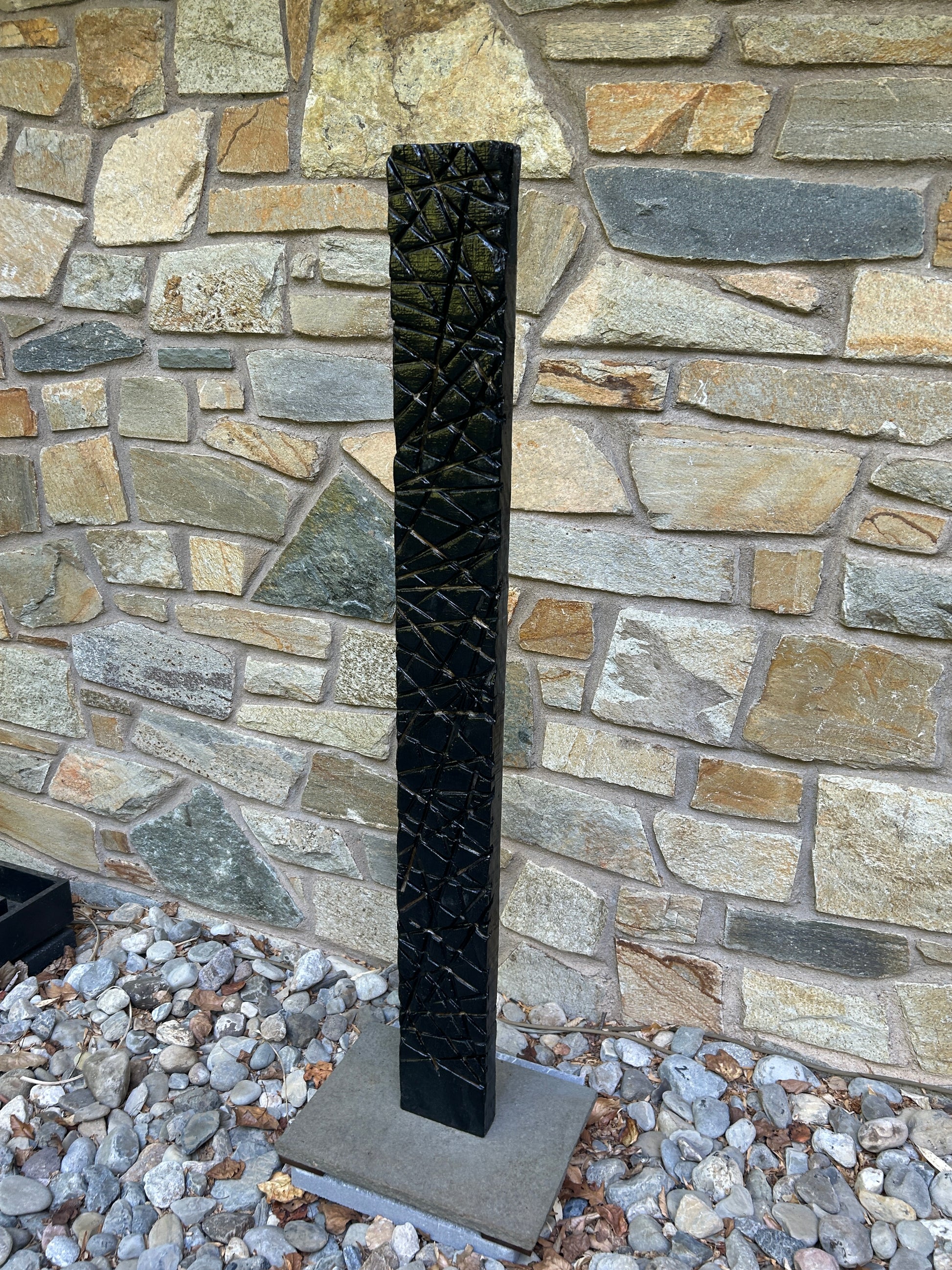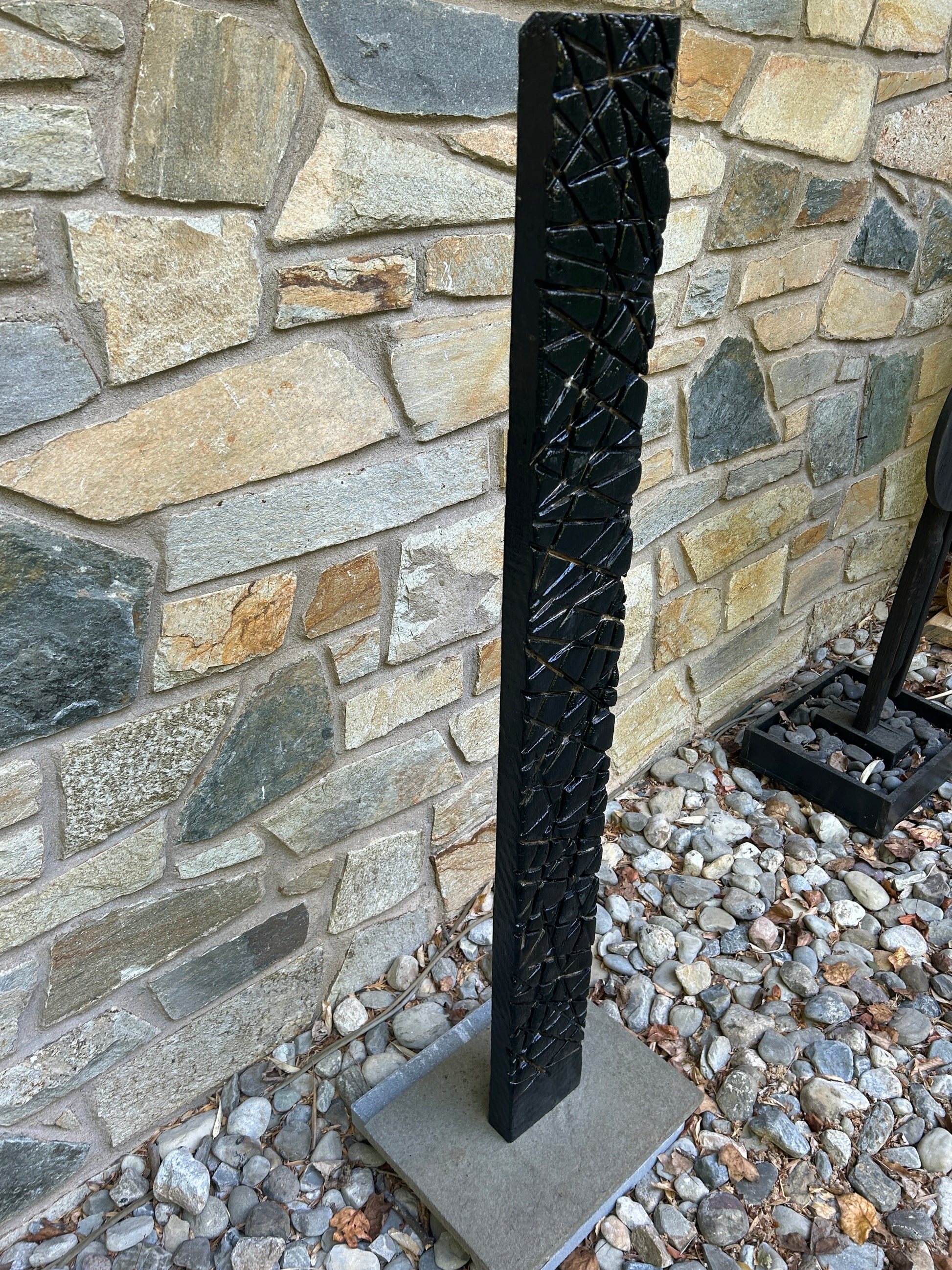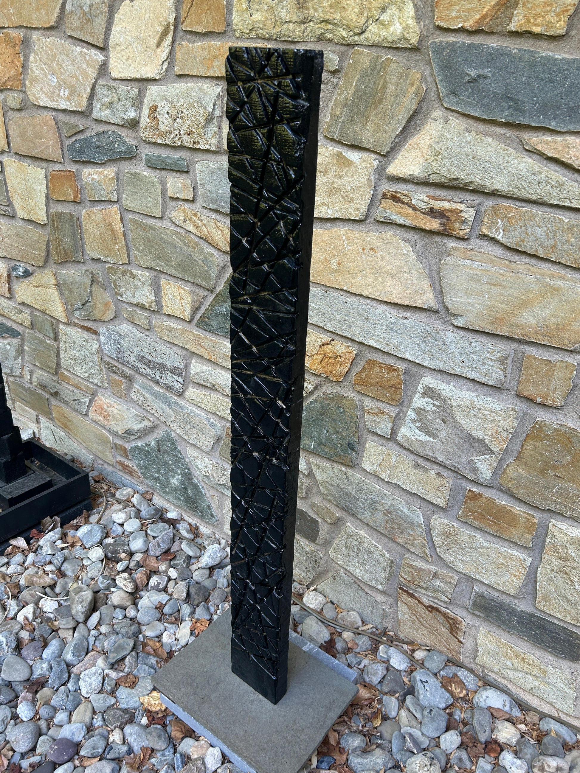 Indoor-Outdoor Chainsaw Totem in Shou Sugi Ban and Linseed Oil/Marine Varnish finish, re-purposed from milled Virginia Walnut plank taken from old barn stock. planed, marked by chainsaw, then stained, burned, and re-stained. Some cut marks heightened by lighter stain. Totem finished in multiple coats of premium Fine Paints of Europe Marine Varnish. Base is old flagstone, roughly 20 lbs., 18” x 13.5”, with rubber foot pads in each corner. Totem attaches securely via two 3/8” captive hanger bolts. it stands roughly 60.5” tall, 6.5” wide, 2” depth. Base adds 1” in height.