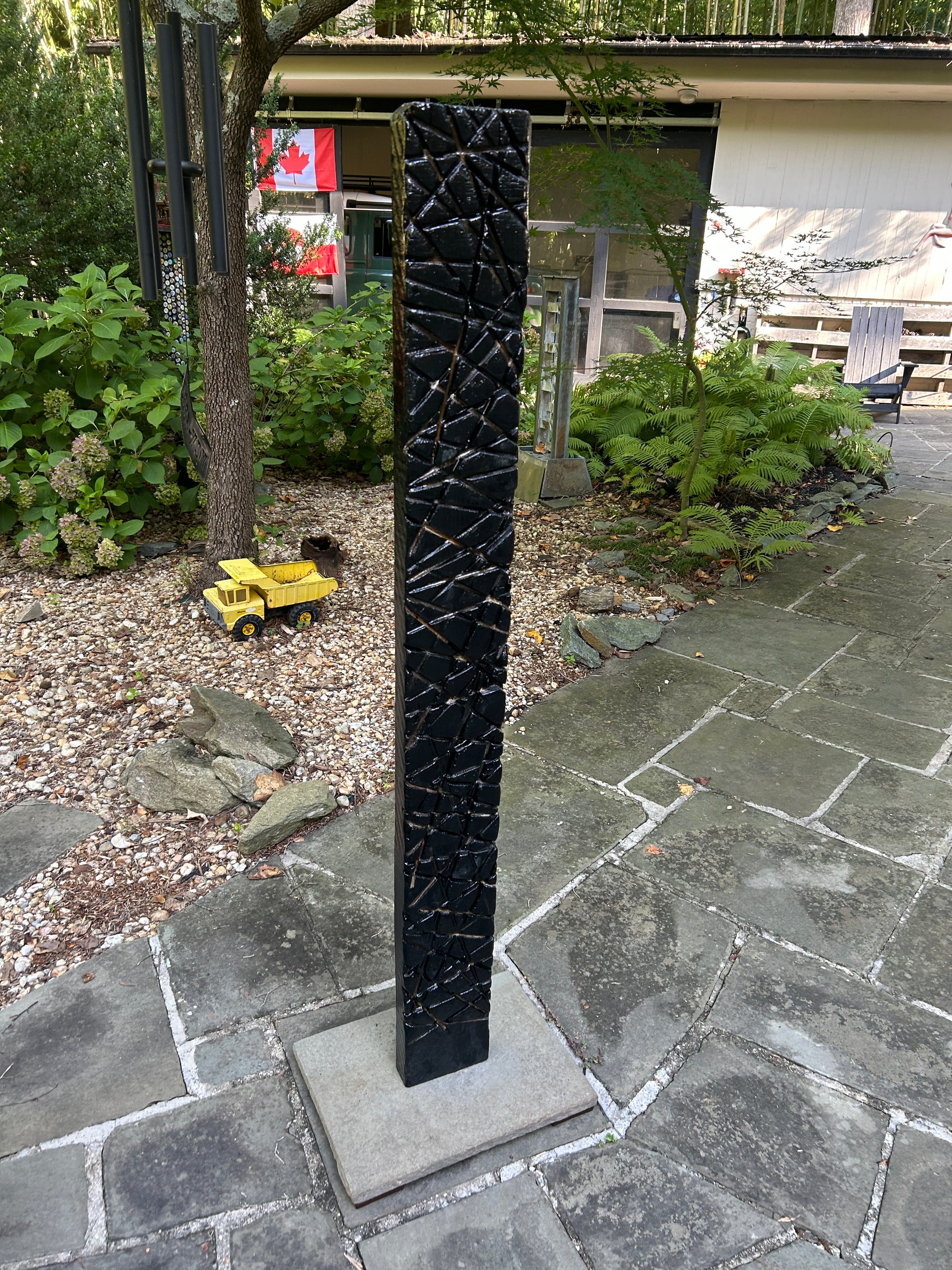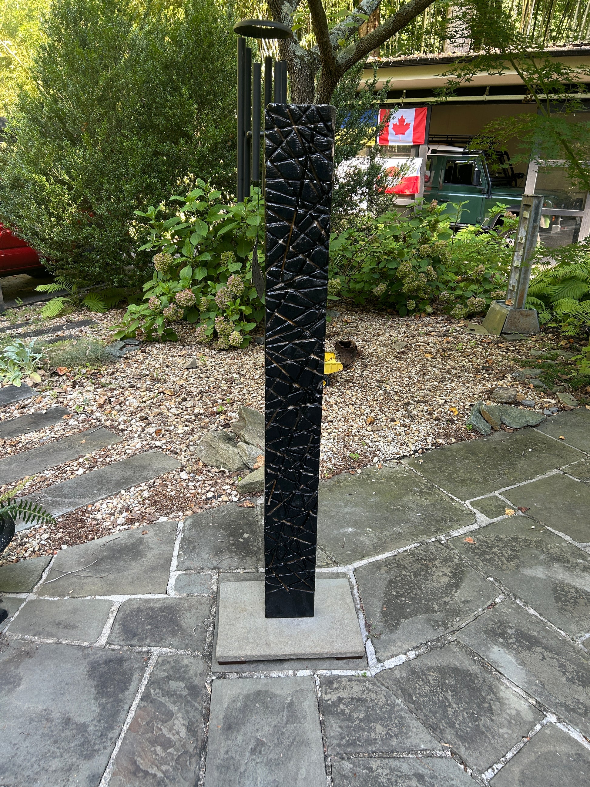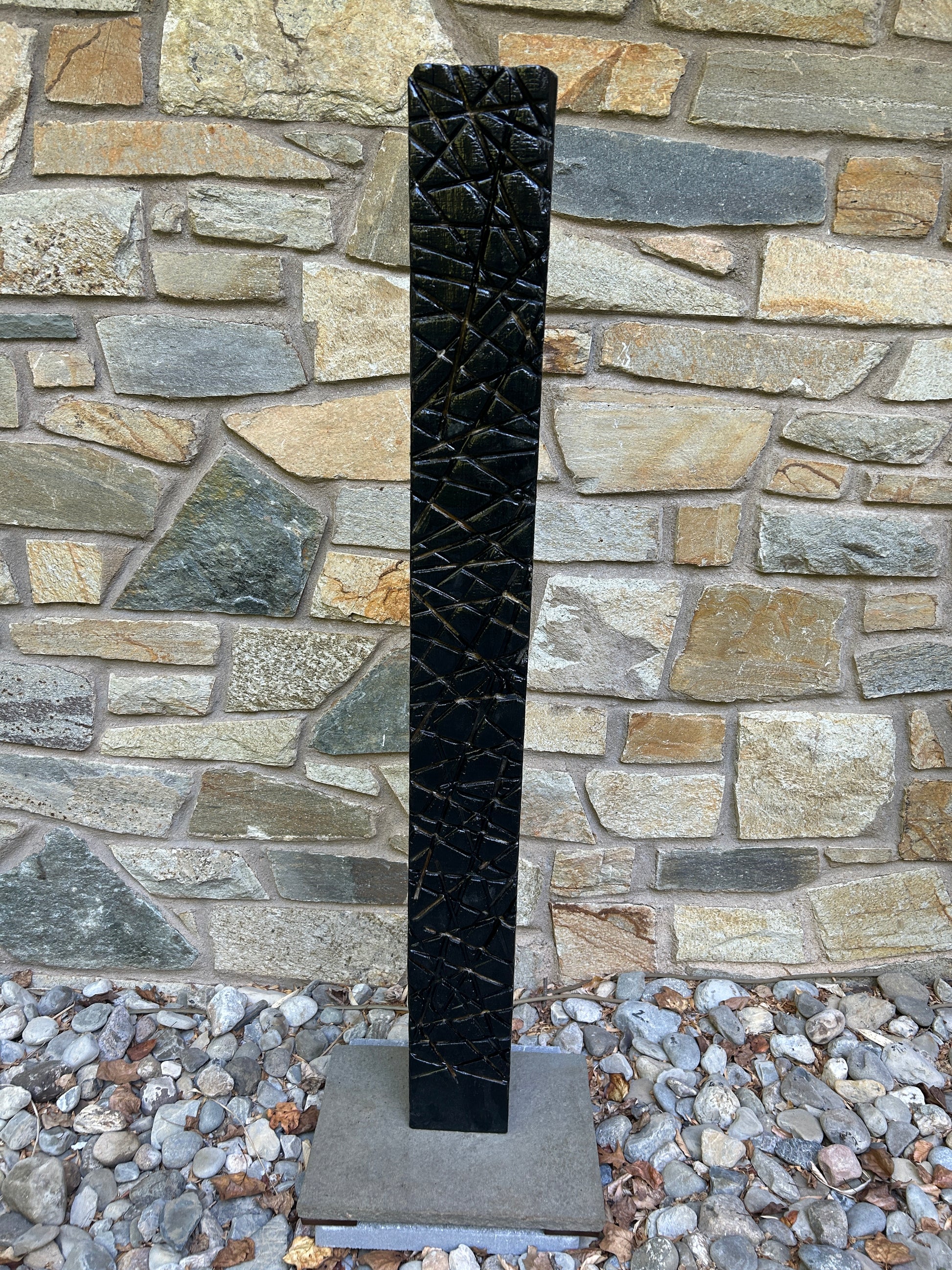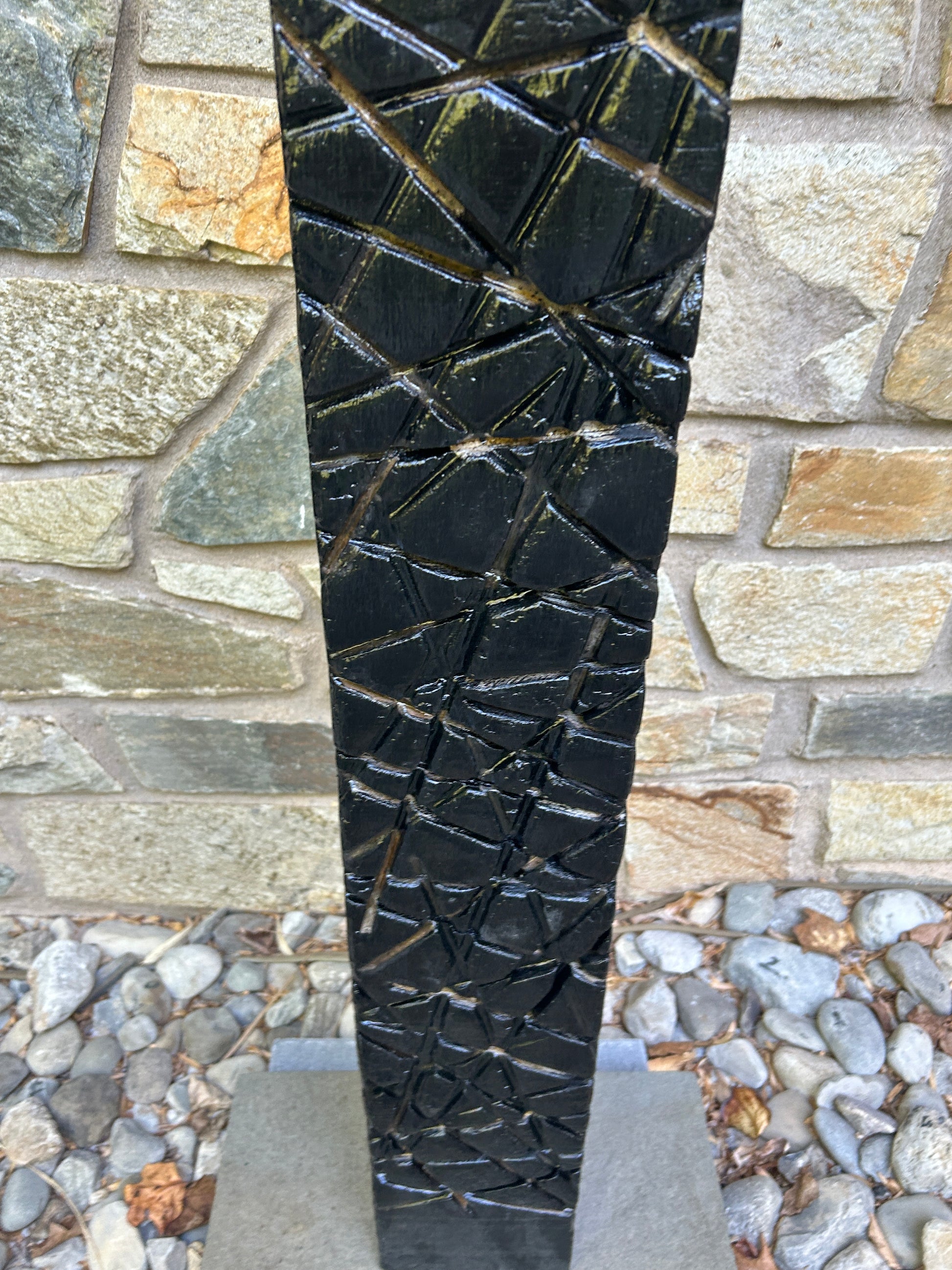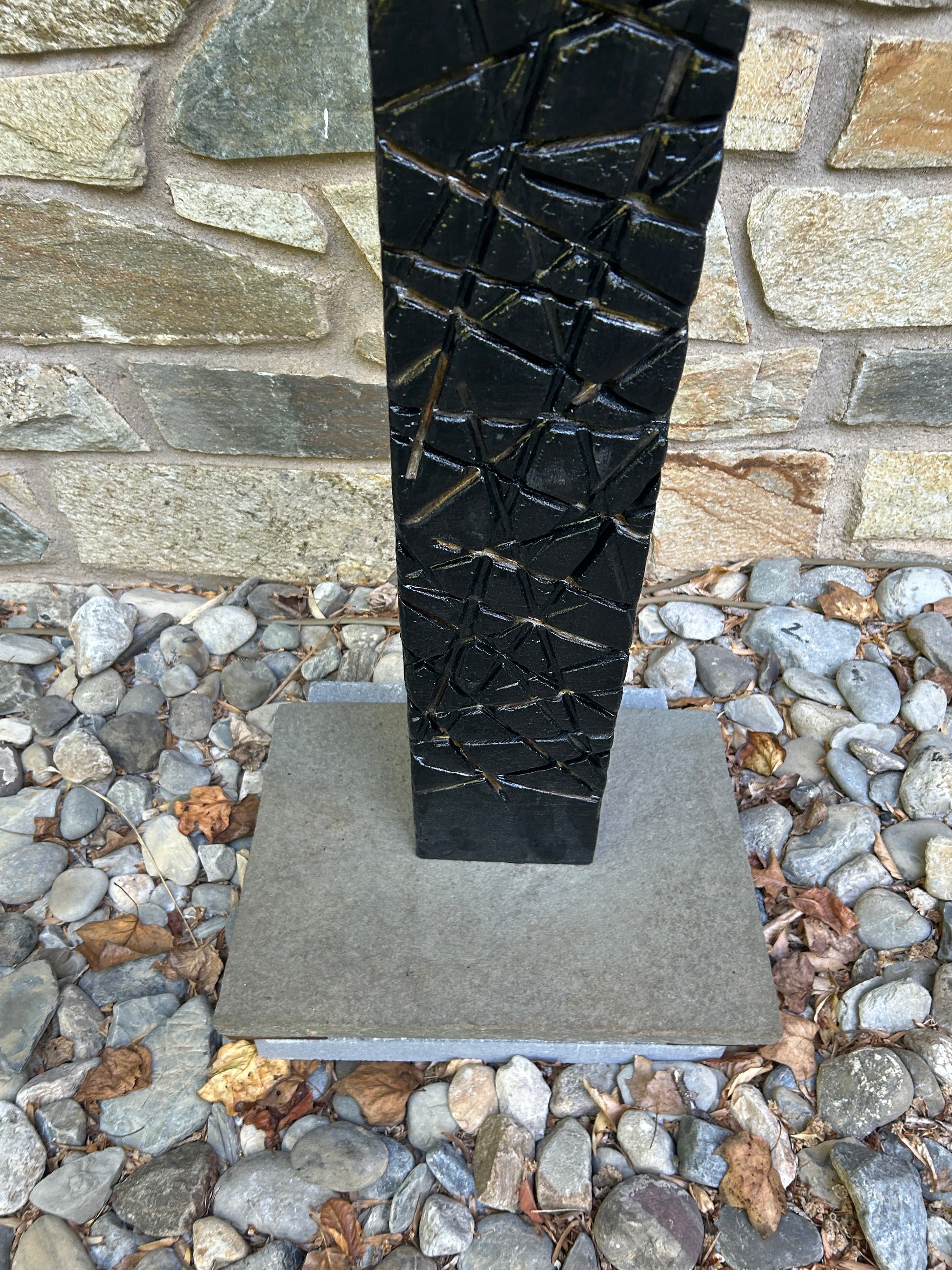 Indoor-Outdoor Chainsaw Totem in Shou Sugi Ban and Linseed Oil/Marine Varnish finish, re-purposed from milled Virginia Walnut plank taken from old barn stock. planed, marked by chainsaw, then stained, burned, and re-stained. Some cut marks heightened by lighter stain. Totem finished in multiple coats of premium Fine Paints of Europe Marine Varnish. Base is old flagstone, roughly 20 lbs., 18” x 13.5”, with rubber foot pads in each corner. Totem attaches securely via two 3/8” captive hanger bolts. it stands roughly 60.5” tall, 6.5” wide, 2” depth. Base adds 1” in height.
