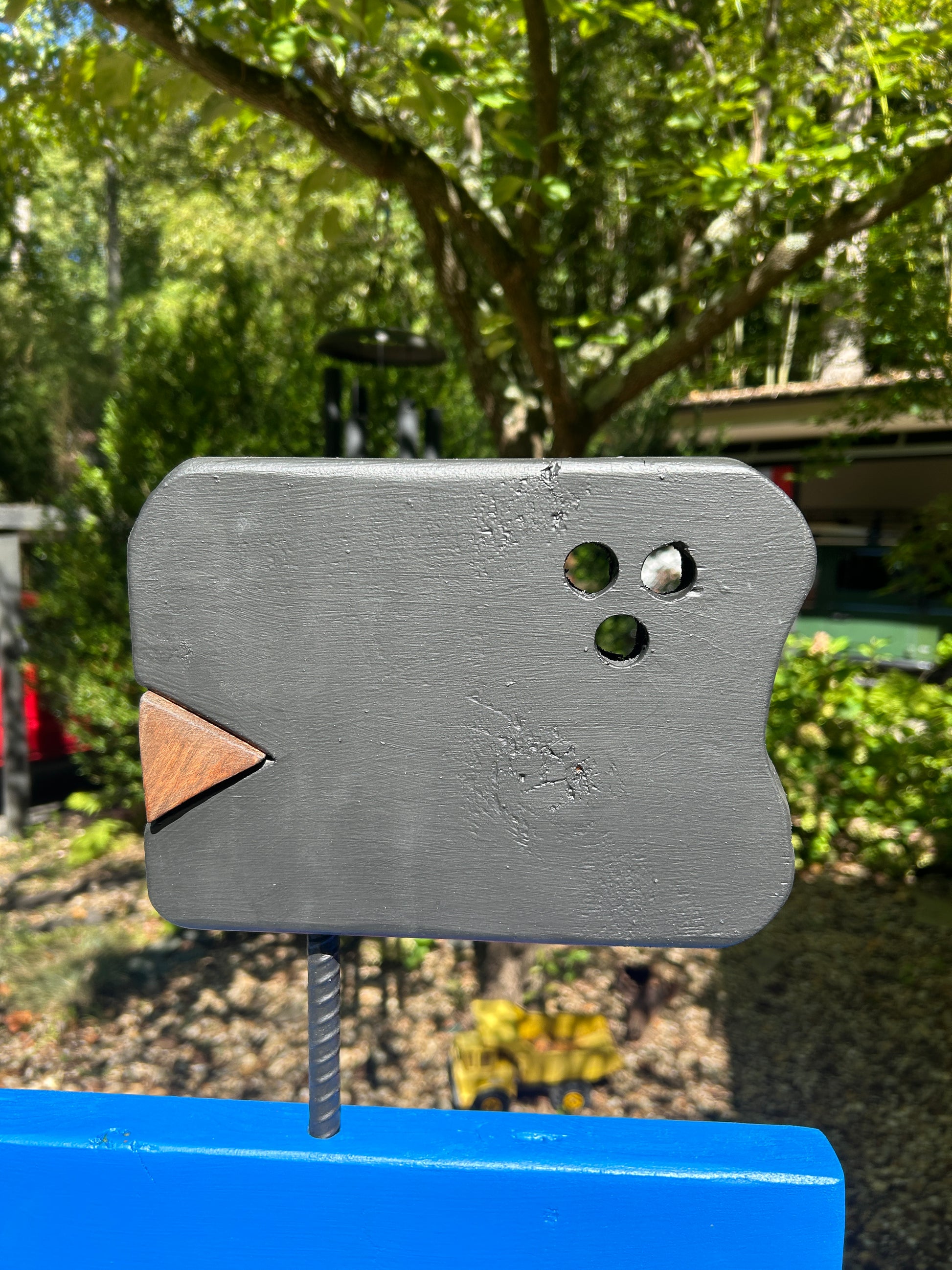 Construction arrived through use of a variety of power and hand saws and grinders. Sanded then treated with outdoor wood stain. The sculpture is modular in that it comes in ten separate pieces— including 2x8 and 2x6 body pieces, 2x4 arms and joints, as well as three sections of rebar— that all fit or bolt very easily together with existing fittings and hardware.
