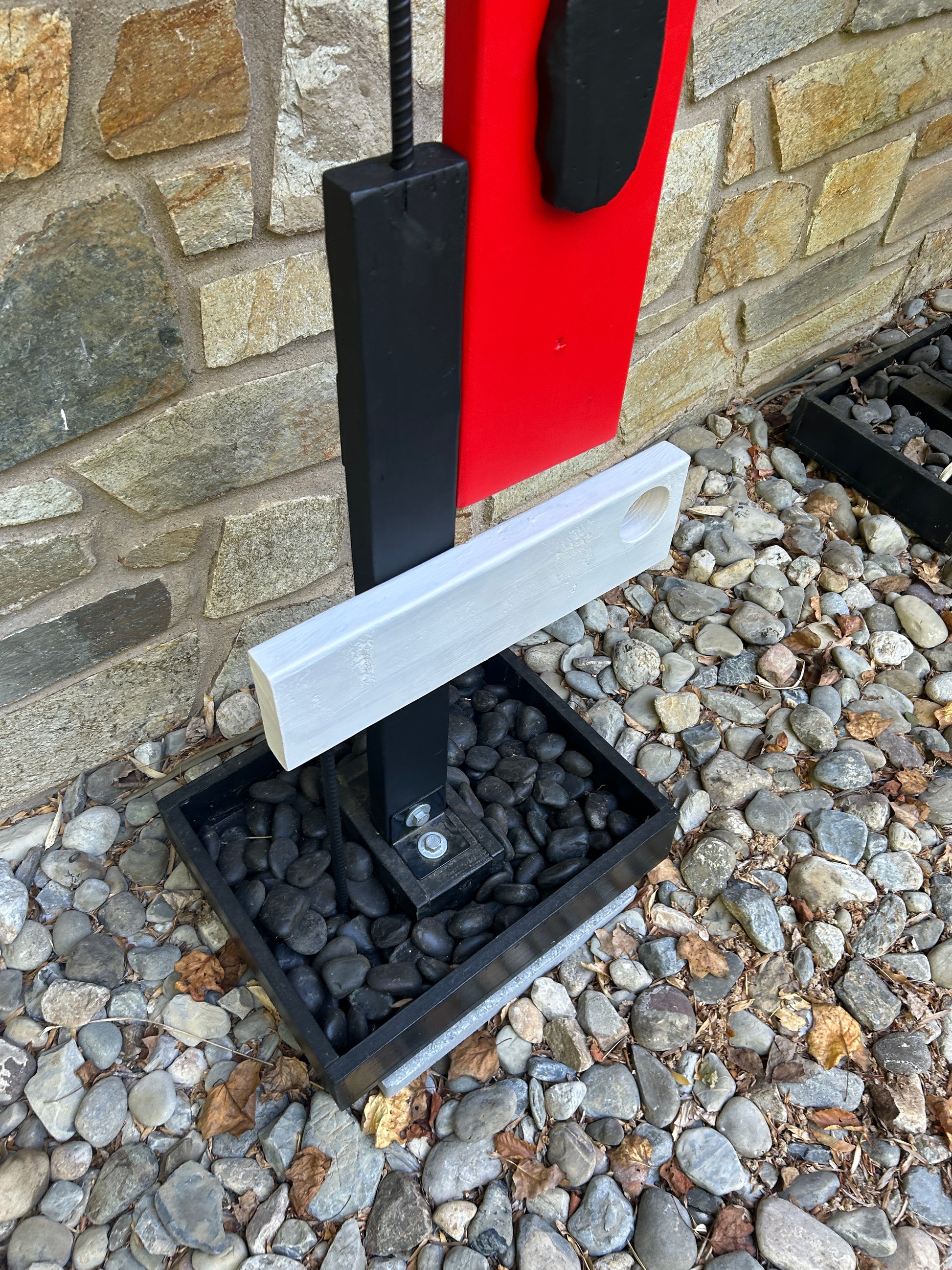 Modular Totemic Sculpture, Painted and Stained, based on 2x4/2x6/2x8 Douglas Fir blanks. This sculpture and base are are designed for indoor or outdoor display. Outdoor installation is best accomplished through setting in concrete or, in many applications, by utilizing the included stained and sealed base. The sculpture stands roughly 63.5” tall and approximately 20” at its widest span. The 20” x 16” x 3.5” base can be filled with ballast (it is pictured with loose gravel and then black Ash Beach pebbles—$18/30 lb. bag at Home Depot) and it comes with adjustable feet to assist at arriving to a level stance on a hard outdoor surfaces or on floors and carpets indoors.