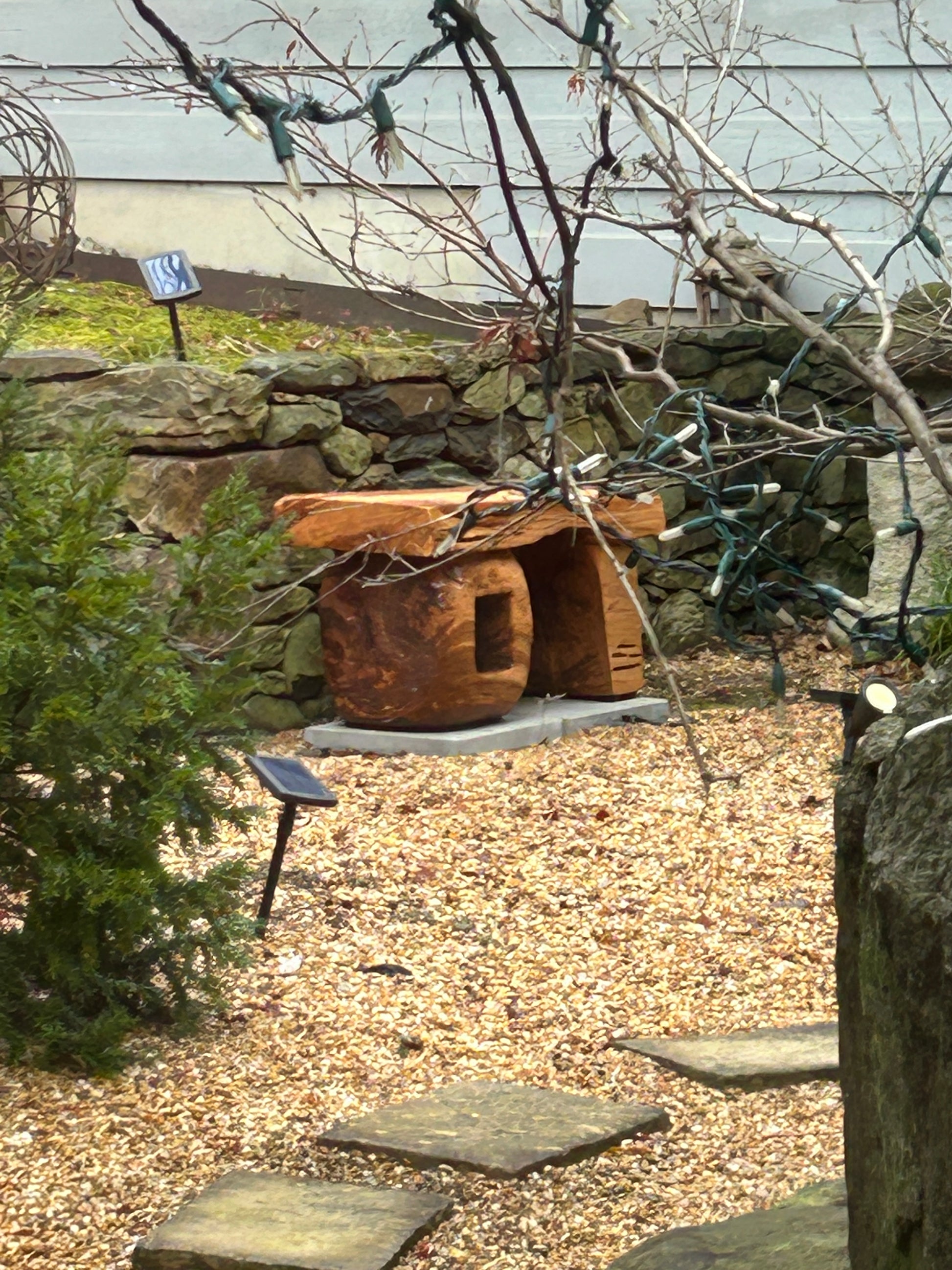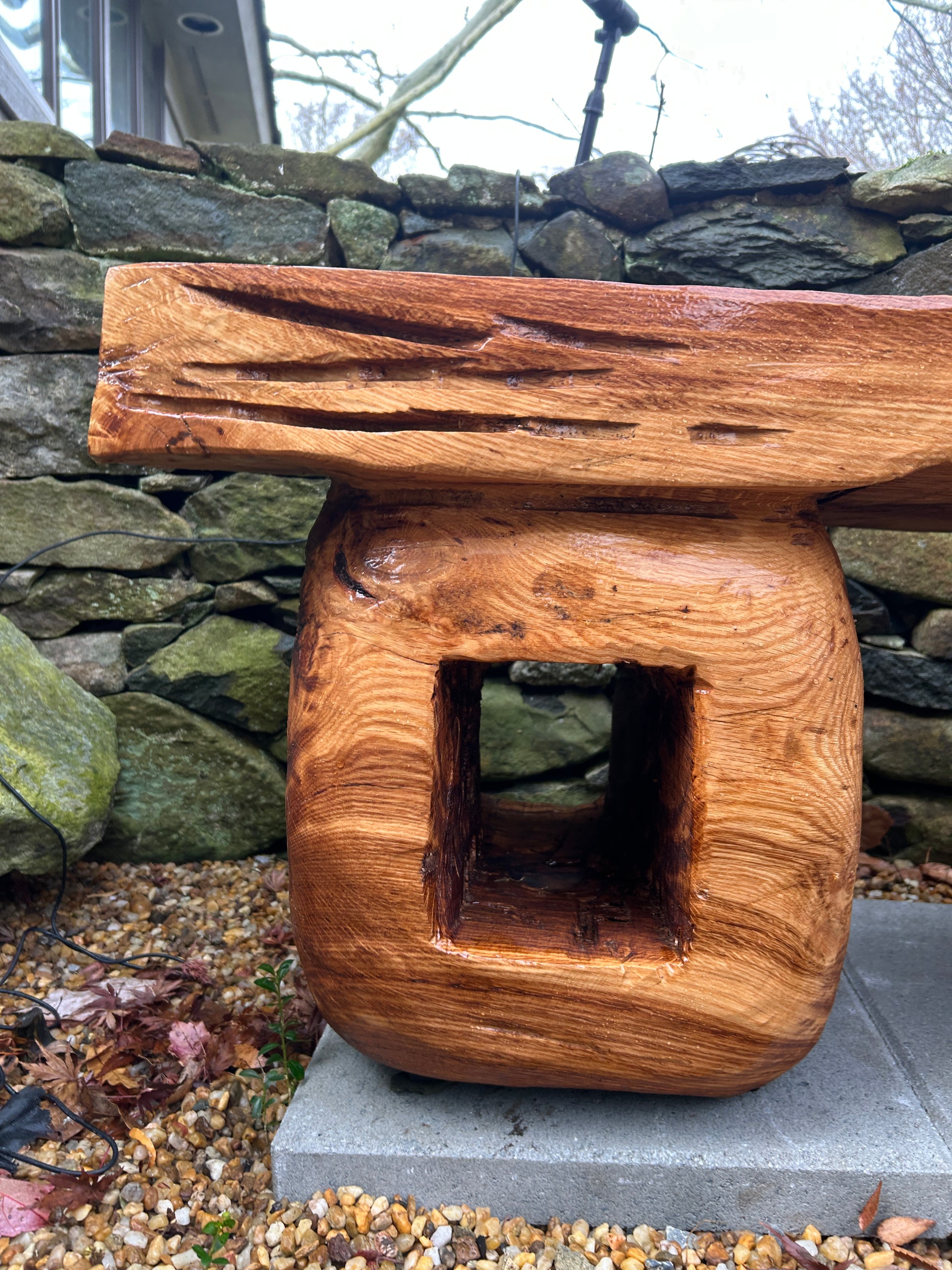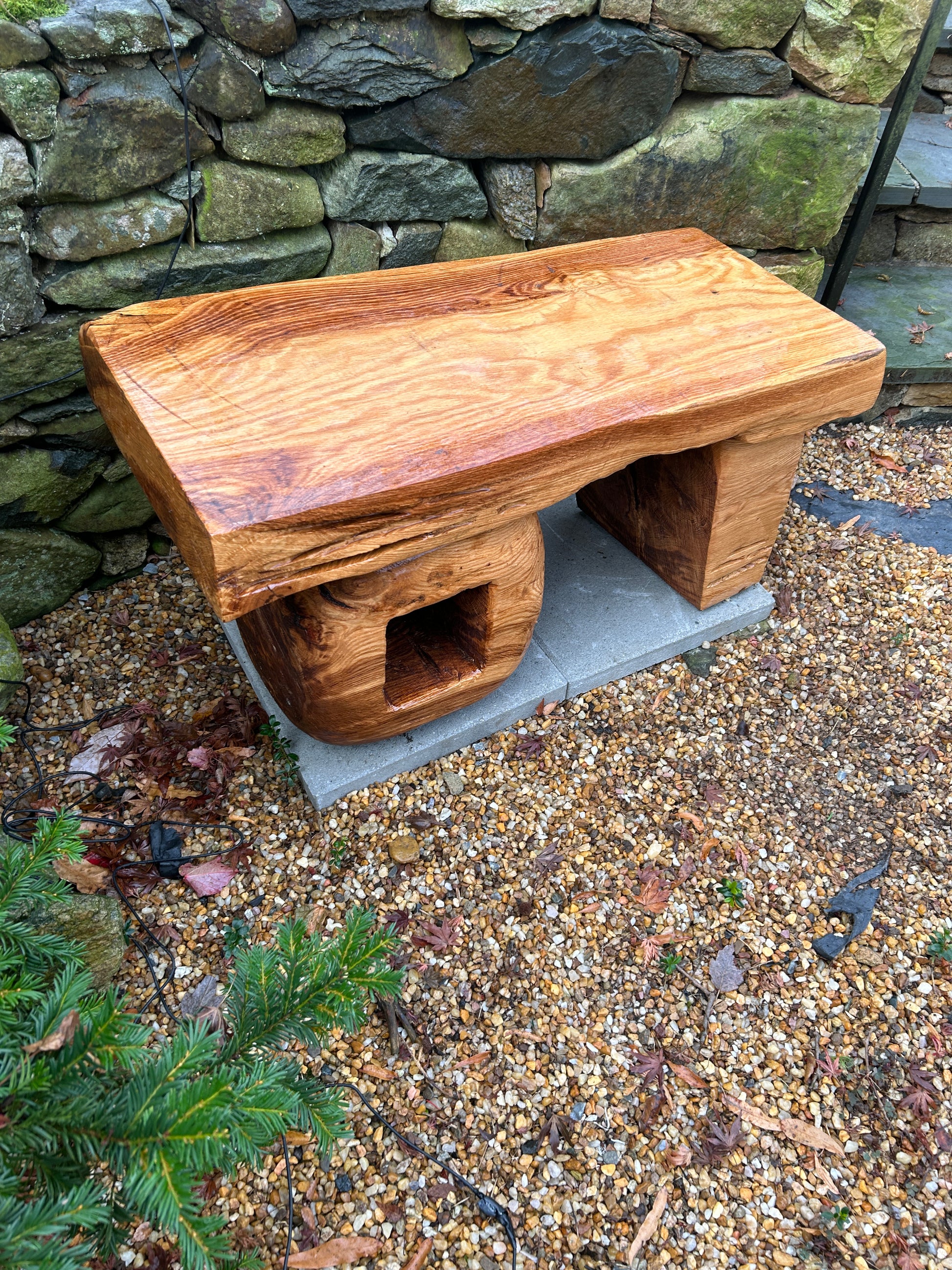 Organically-derived solid White Oak Bench #1 for indoor or outdoor placement. Bench started out as 40”x30”x25” round of Maryland White Oak. Cut and shaped through chainsaw and Alaskan Saw Mill to solid block. Further cut and shaped with variety of Stihl chainsaws and angle grinders. Finished in multiple coats of Fine Paints of Europe Marine Varnish. Rubber feet for elevation off floor or outdoor surfaces. Bench weighs about 300 pounds. Bench photos show one made to order and sold to buyer in Middleburg, Virginia.